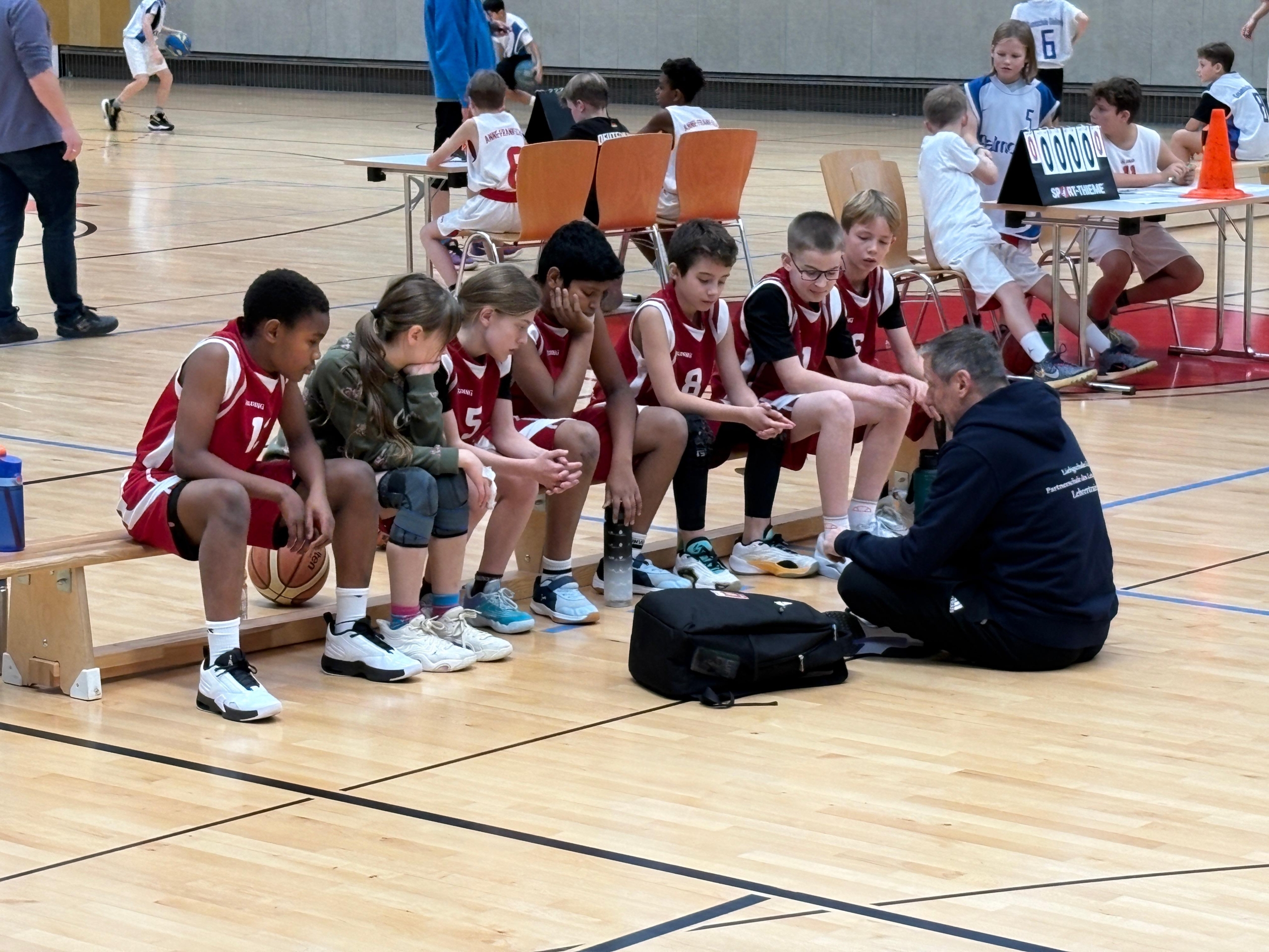 U14-Mannschaft auf der Bank mit TrainerIm letzten Spiel des Tages traf man auf die Dietrich Bonhöfer Schule aus Lich, die bereits gegen die GGO verloren hatte. Doch anders als in den vorherigen Spielen agierte das Team der Liebigschule diesmal nicht so gut als Mannschaft. Viele Einzelaktionen und vergebene Chancen führten dazu, dass die DBS sich zur Halbzeit bereits auf neun Punkte absetzen konnte. Nach der Halbzeit zeigte man sich dann wieder von einer besseren Seite. Mit vollem Einsatz in der Defensive und tollem Zusammenspiel kam man auf zwei Punkte heran, ehe den Spielern die Kraft etwas ausging und die DBS verdient das Spiel gewann. Im Dreiervergleich hatte die Lio dann aber doch mit einem Korb Vorsprung die Nase vorn und sicherte sich den Turniersieg. Die Ostschule qualifizierte sich als Zweitplatzierte ebenfalls für den Regionalentscheid im Januar.
